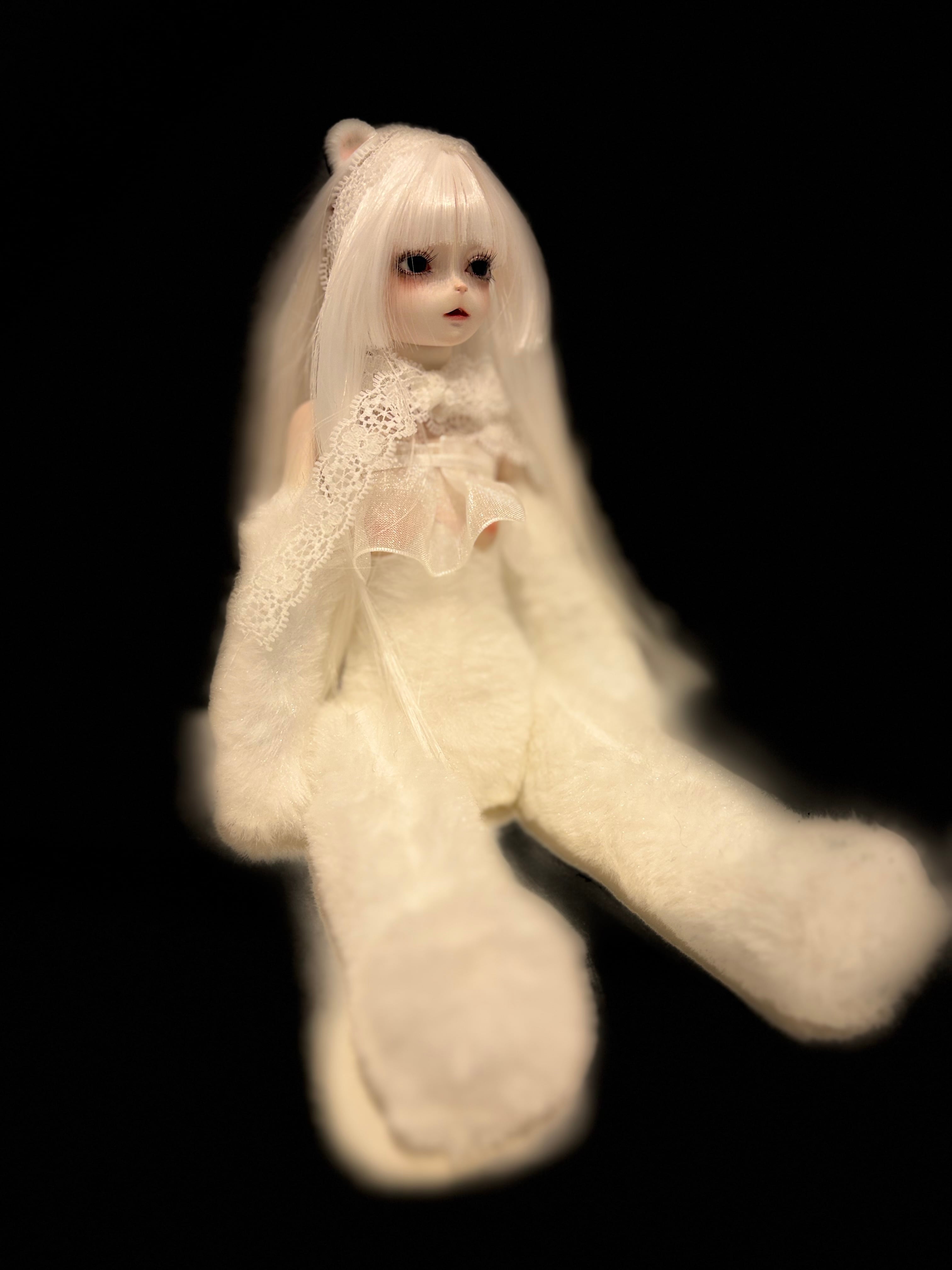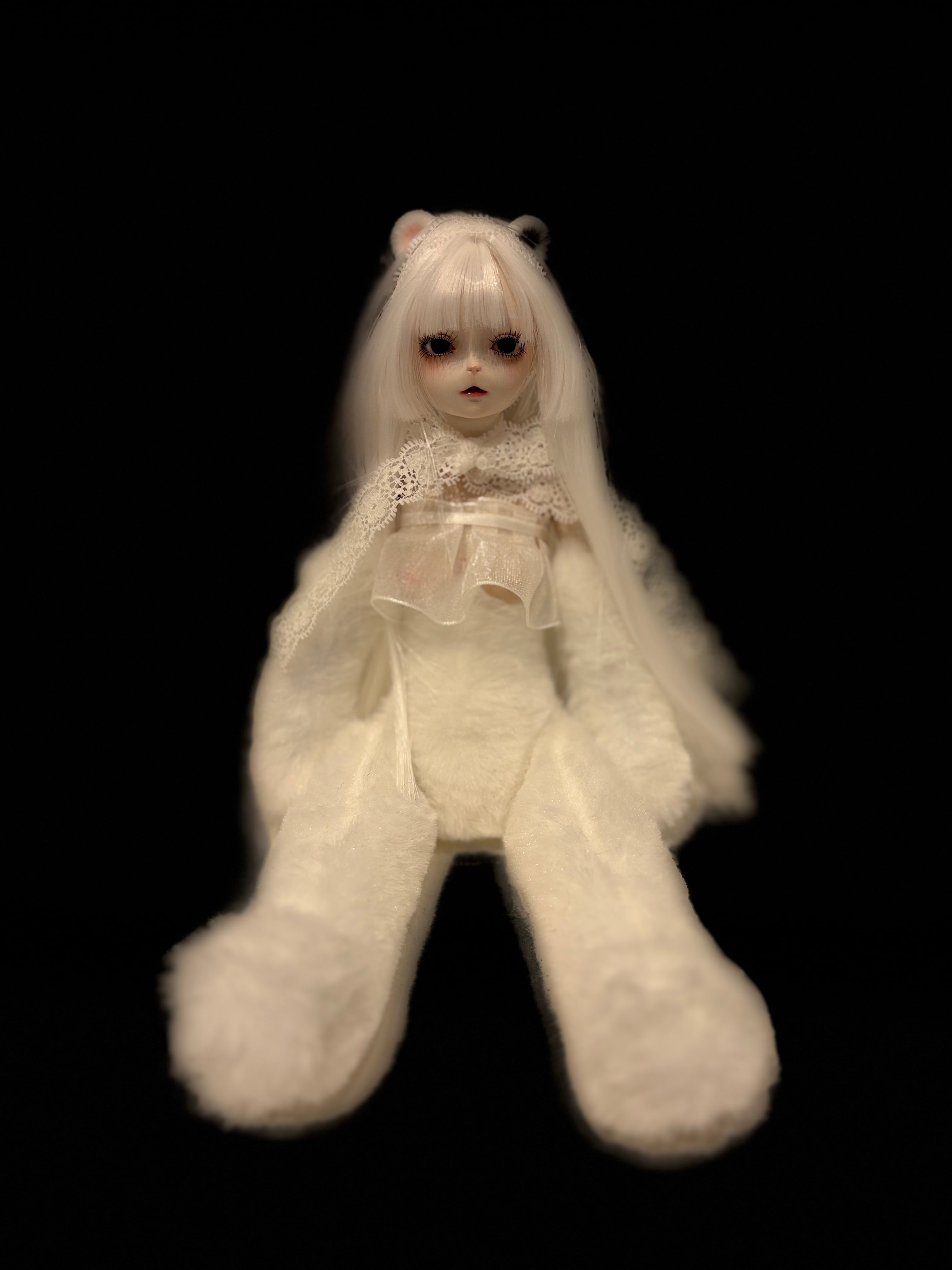 芽々木「ミルル」レジン、油彩、アクリル、磁石、布、耐熱繊維 オリジナルed.1 /2025 <双子の白い子>くまちゃんシリーズ
