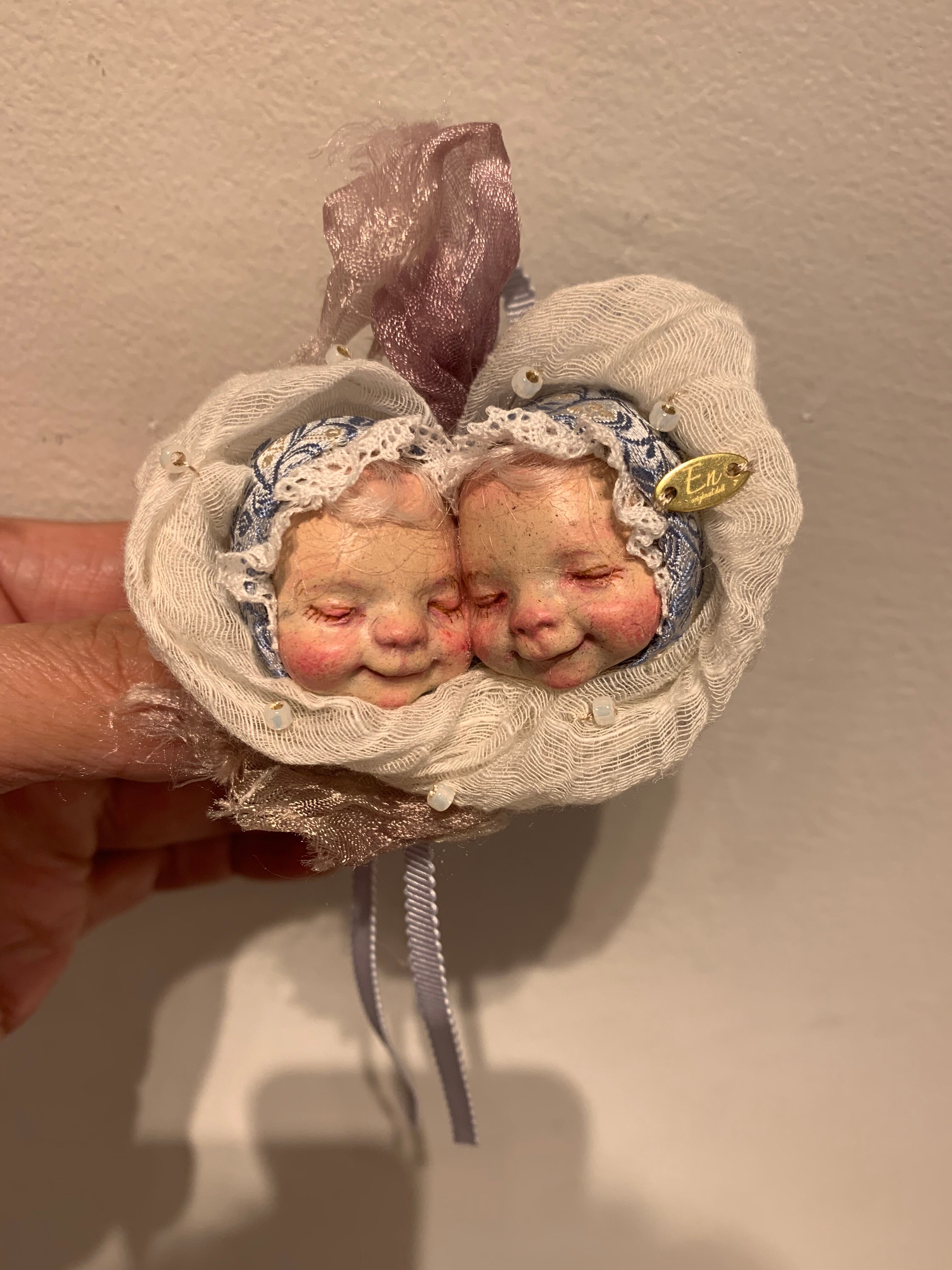 En『双子ちゃんブローチ』B 約7cm 石粉、木粉粘土、モヘア、シルクジャガード他 2025年