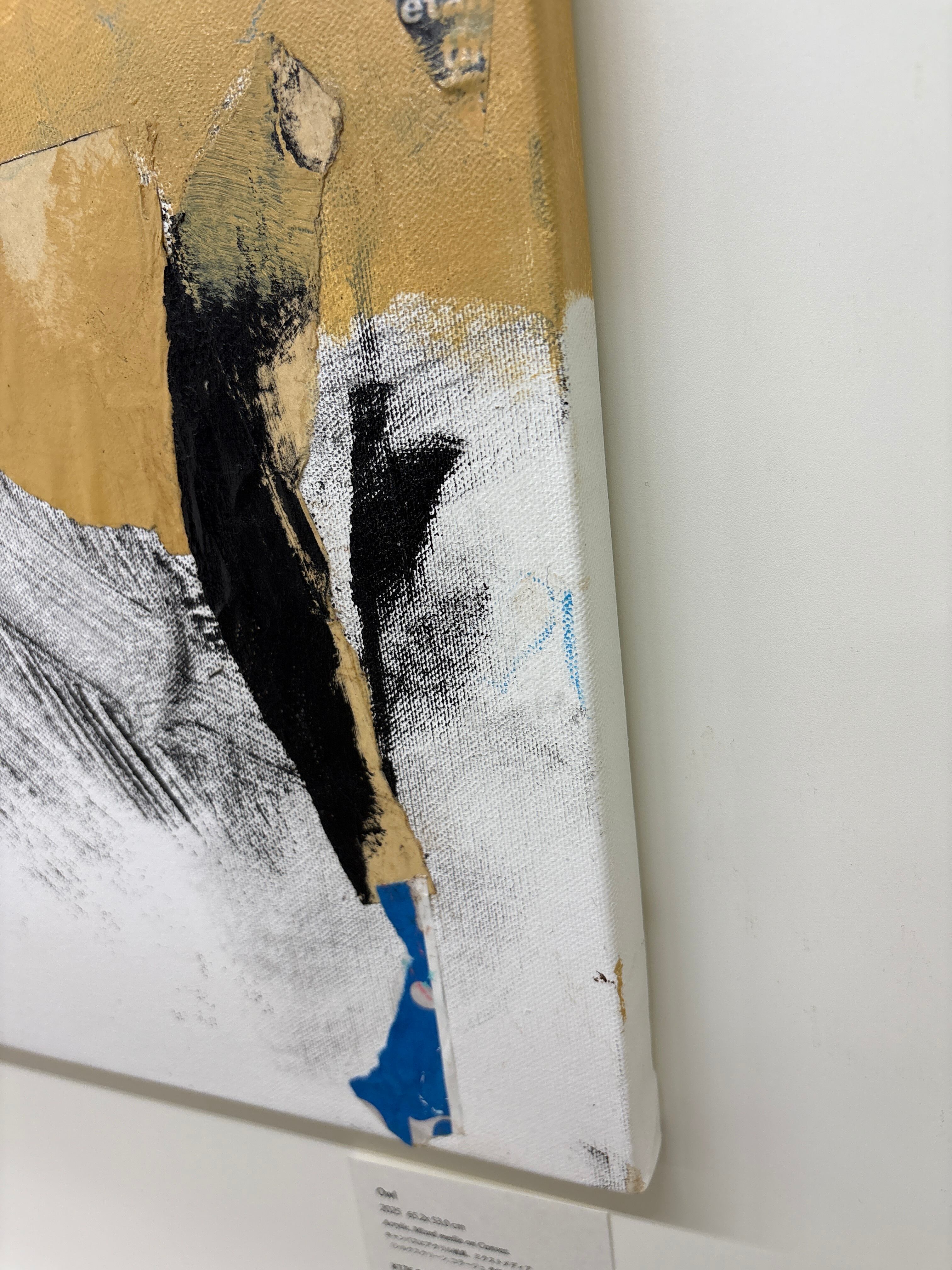 門馬則雄 Owl 652×530mm キャンバスにアクリル絵具、ミクストメディア(シルクスクリーン、コラージュ、色鉛筆、オイルパステル)Acrylic mixed media on Canvas 2025