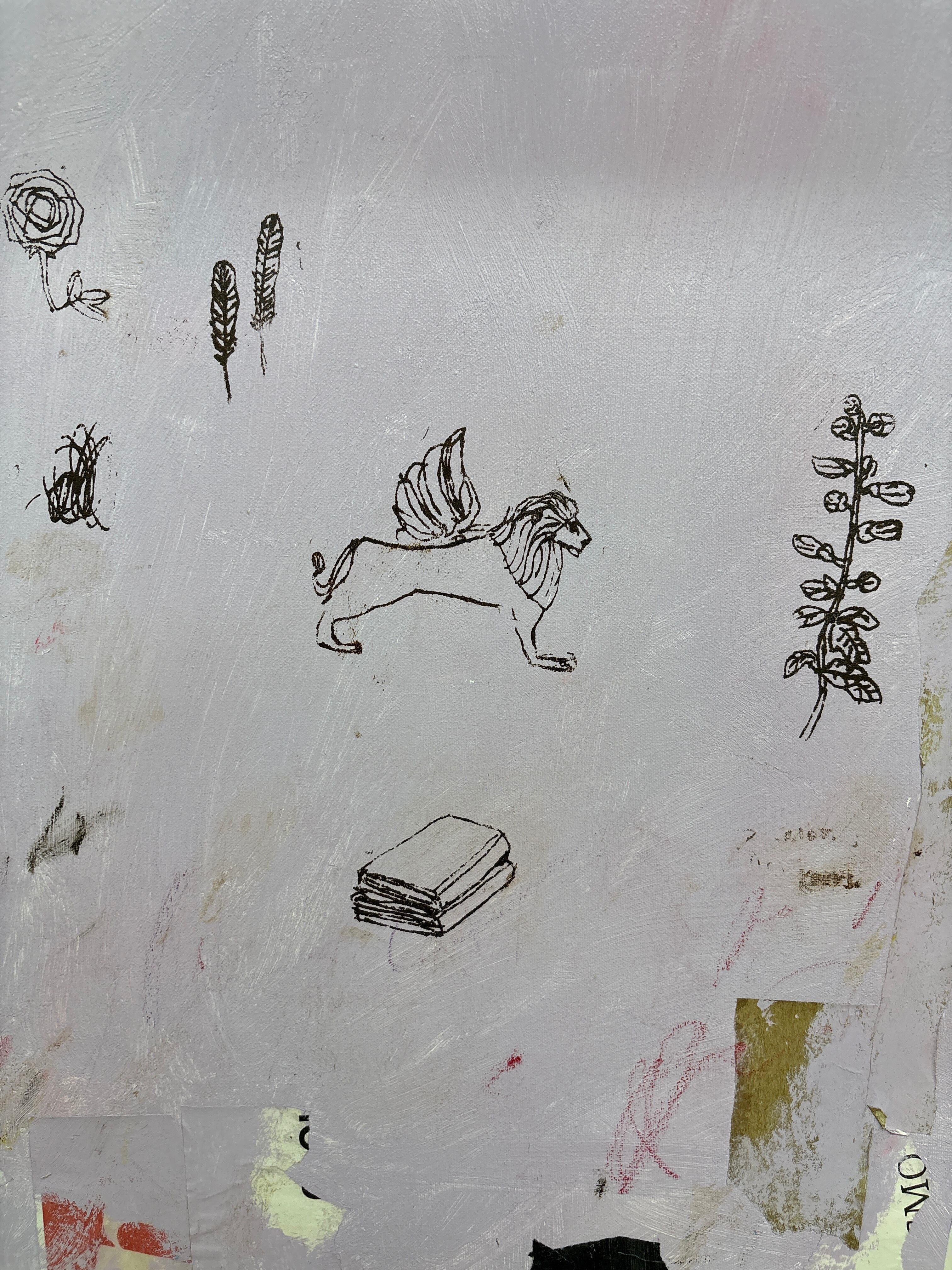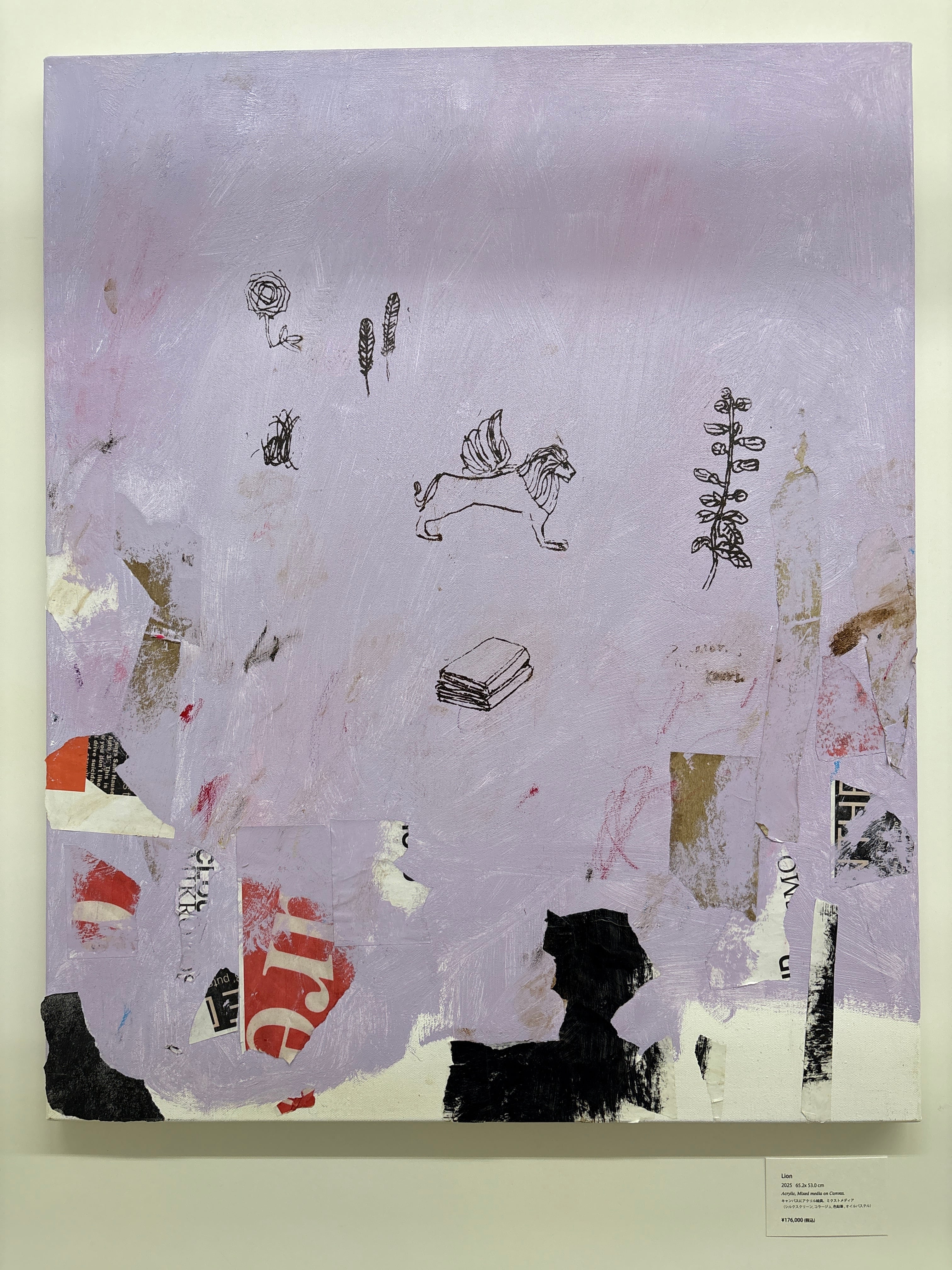 門馬則雄 Lion 652×530mm キャンバスにアクリル絵具、ミクストメディア(シルクスクリーン、コラージュ、色鉛筆、オイルパステル)Acrylic mixed media on Canvas 2025