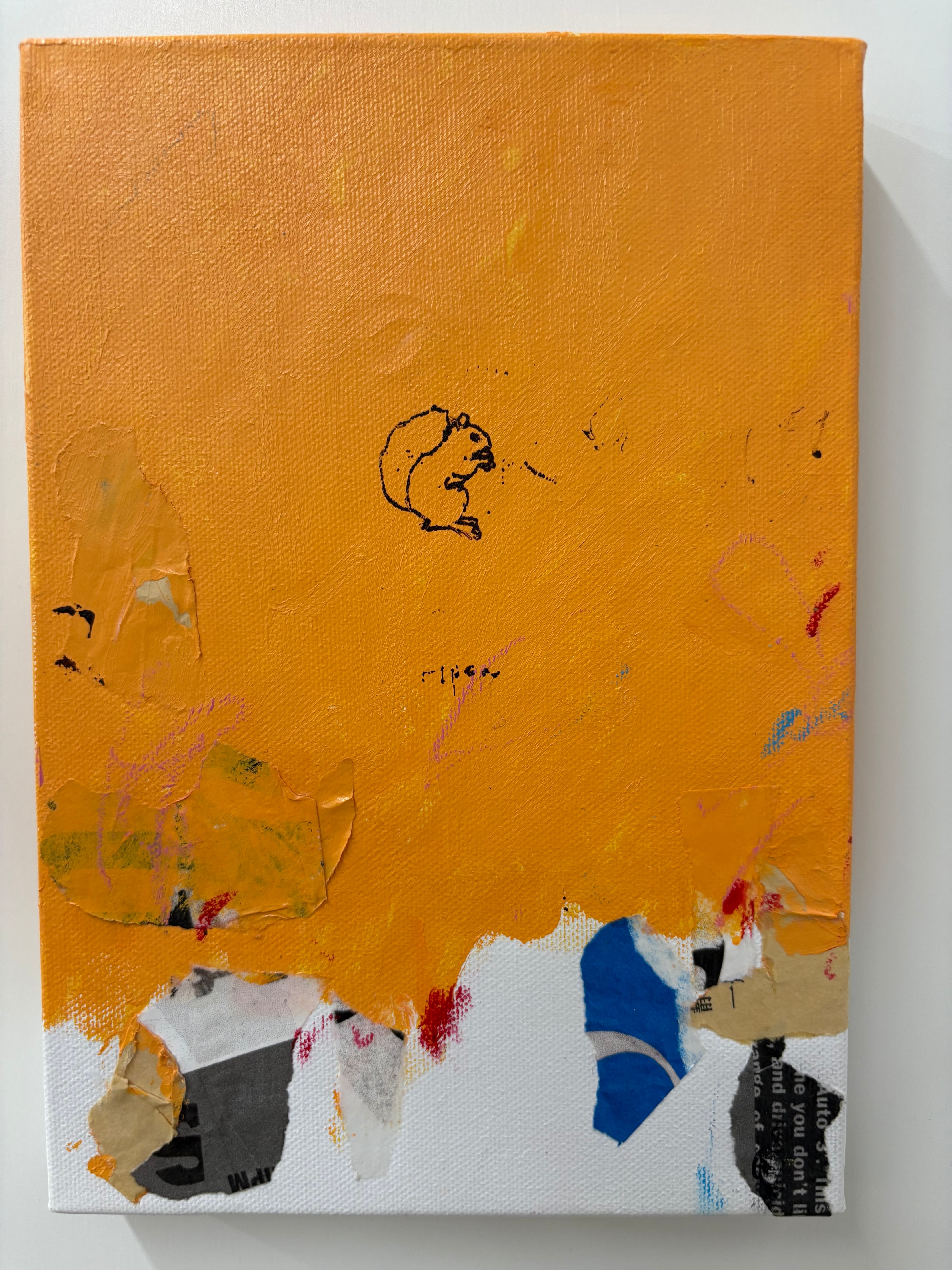 門馬則雄 Squirrel 227×158mm キャンバスにアクリル絵具、ミクストメディア(シルクスクリーン、コラージュ、色鉛筆、オイルパステル)Acrylic mixed media on Canvas 2024