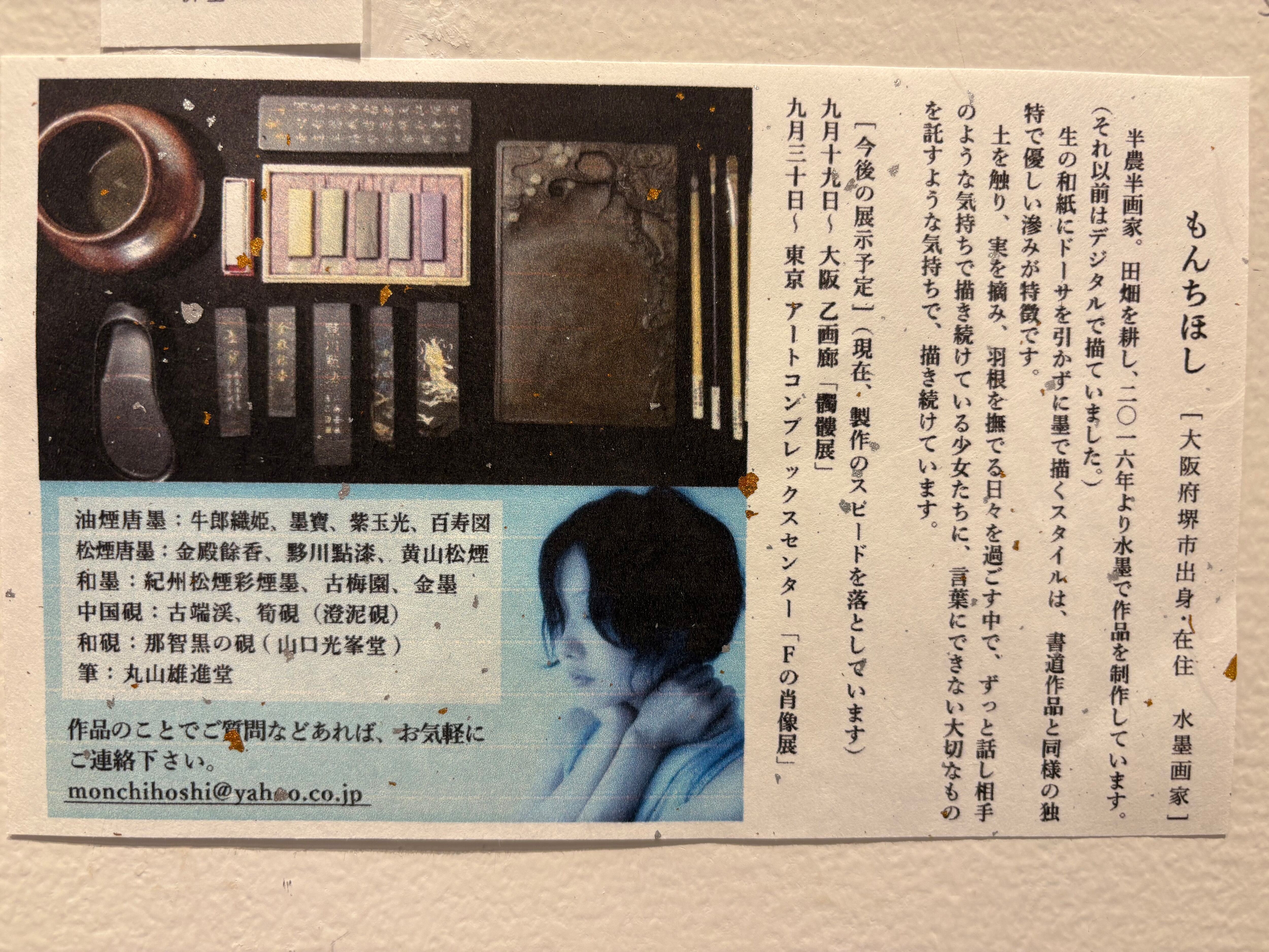 生の和紙にドーサを引かずに墨で描くスタイルは、書道作品と同様の独特で優しい滲みが特徴です。薄墨で柔らかく滲ませたあと、濃く磨った墨でくっきりとした力強くも儚い線を描いていきます。