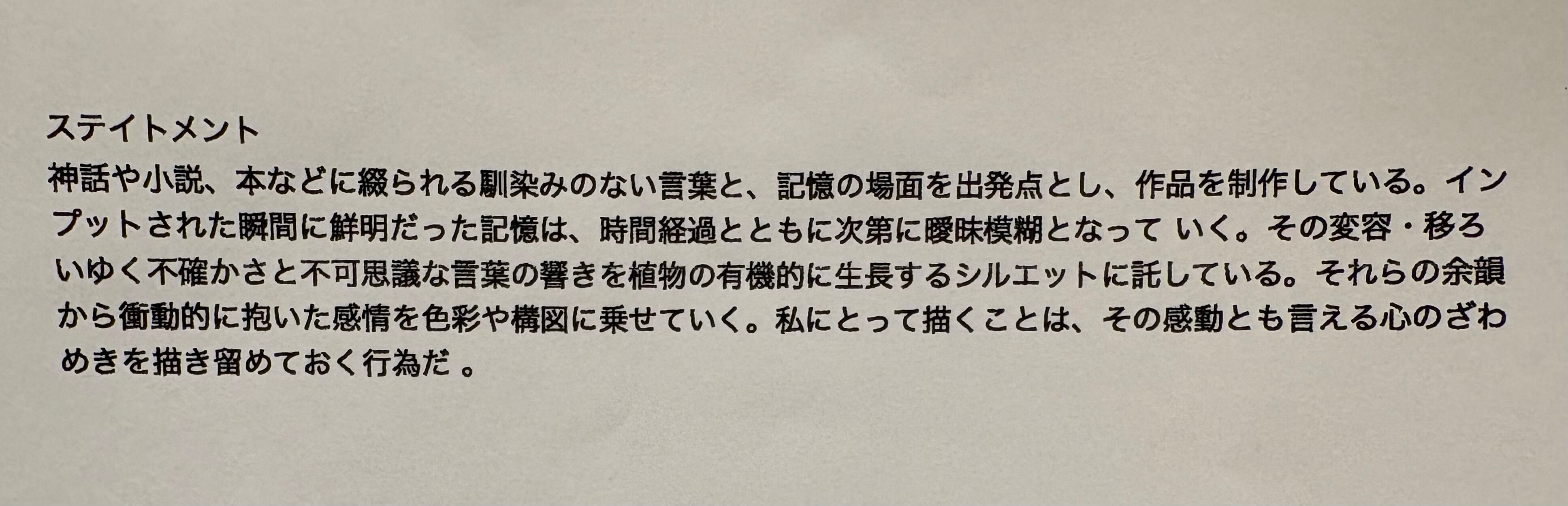 葉々とそれらを支える樹木の質感・有機的で独特な形態を出発点に、絵画独特の空間を描き留めていく。