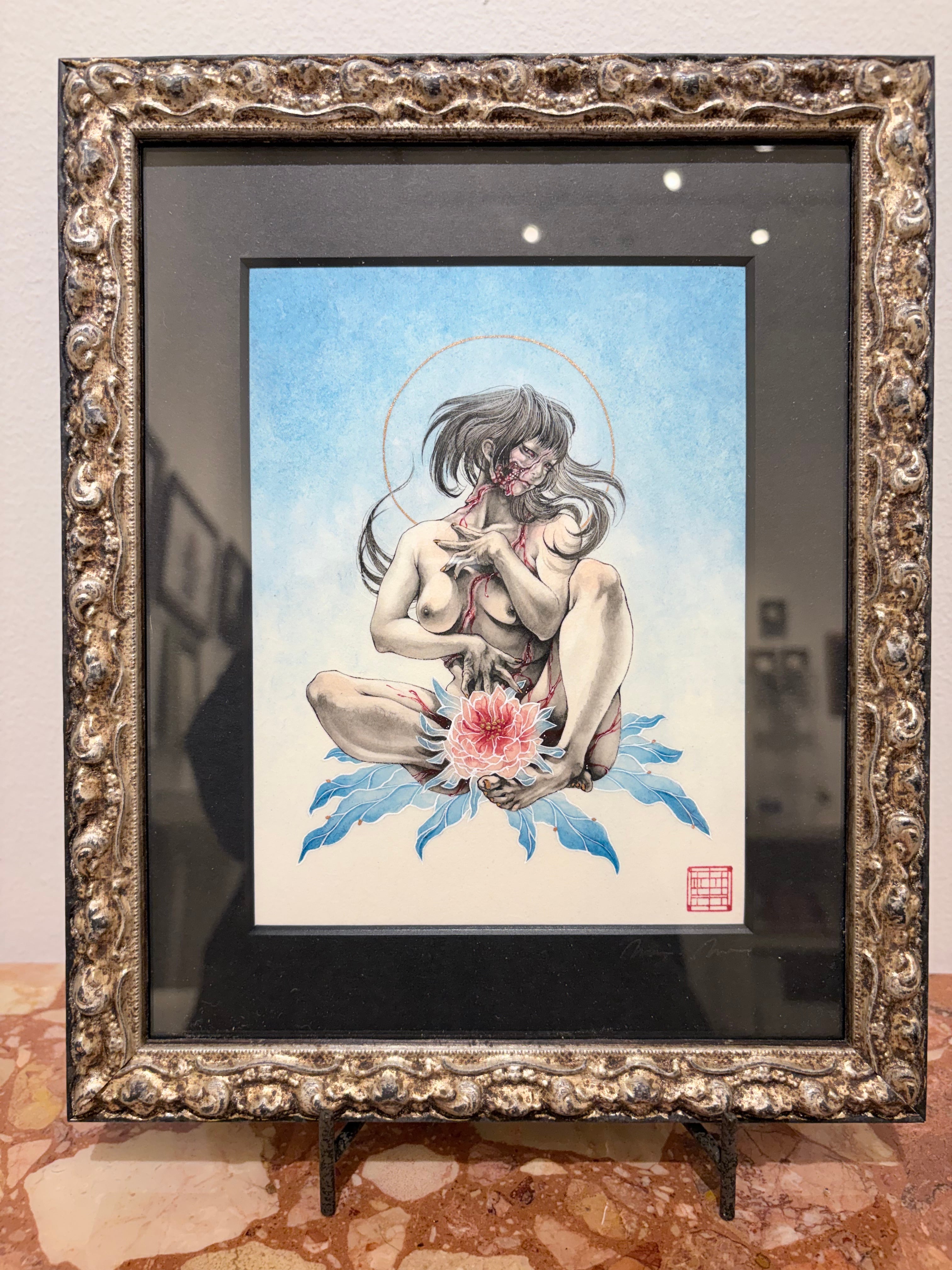 冥麿「一夜迄(ひとよまで)」額付き 楮紙にアクリル絵具、墨