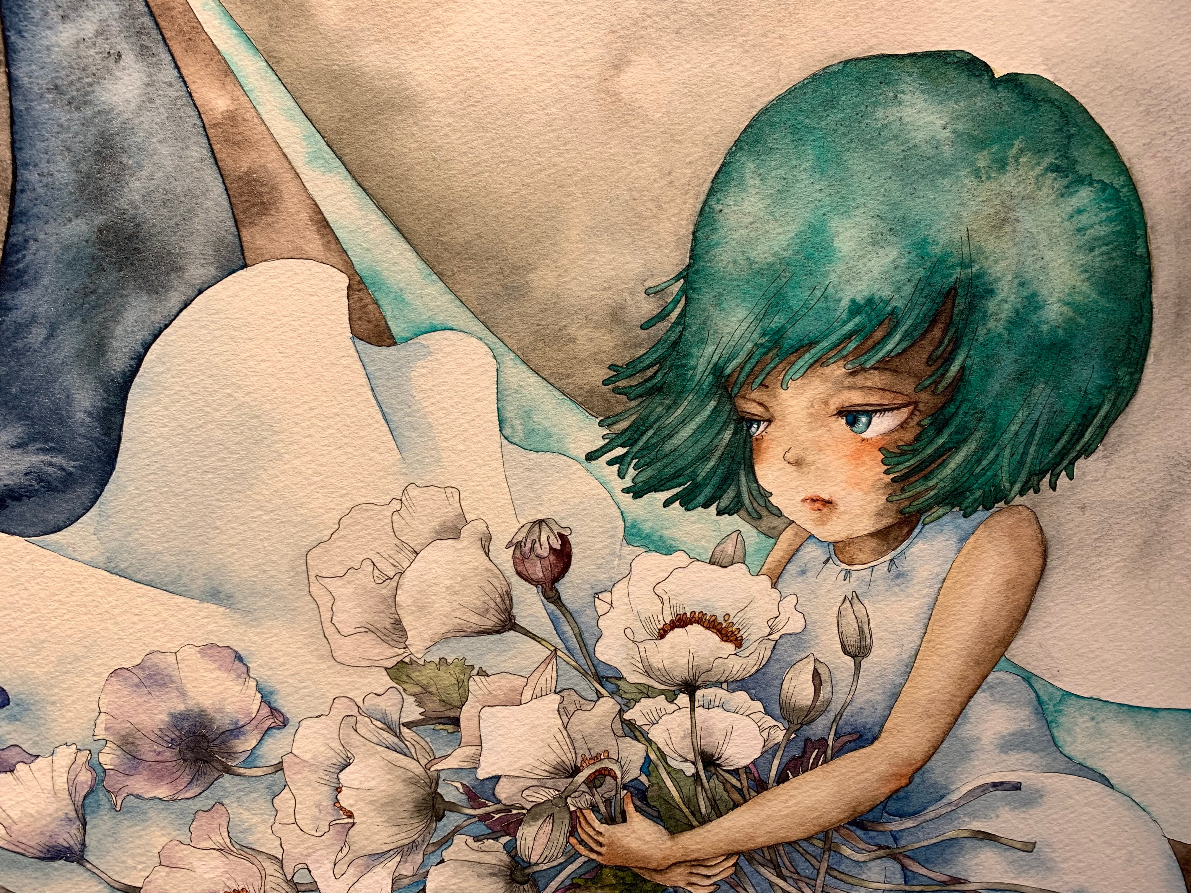 新家智子「So.Ma.Ru」53×73cm パネルに和紙、透明水彩
