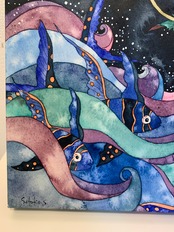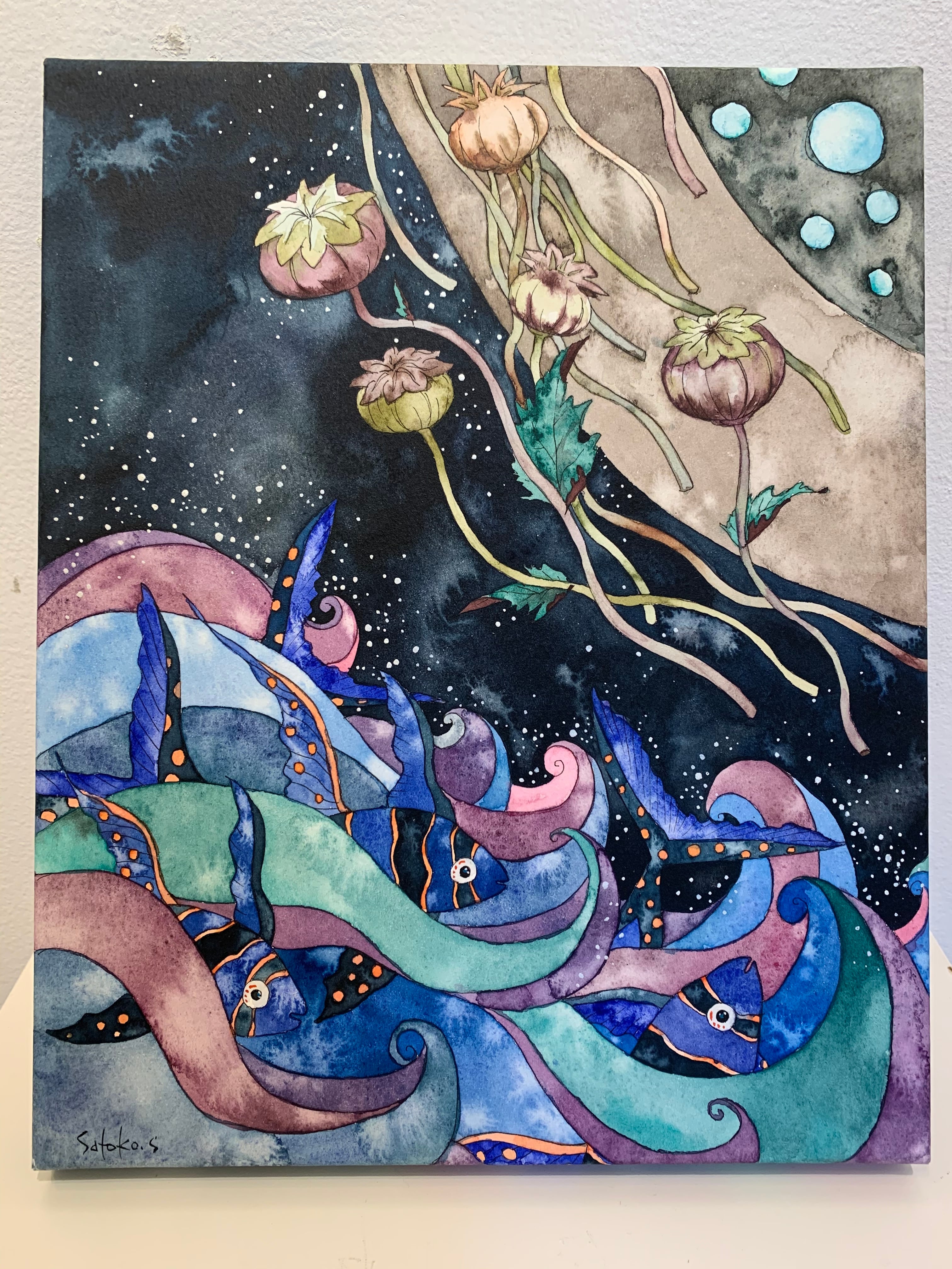新家智子「So.Ma.Ru -Fish」27.5×22.5cm パネルに和紙、透明水彩