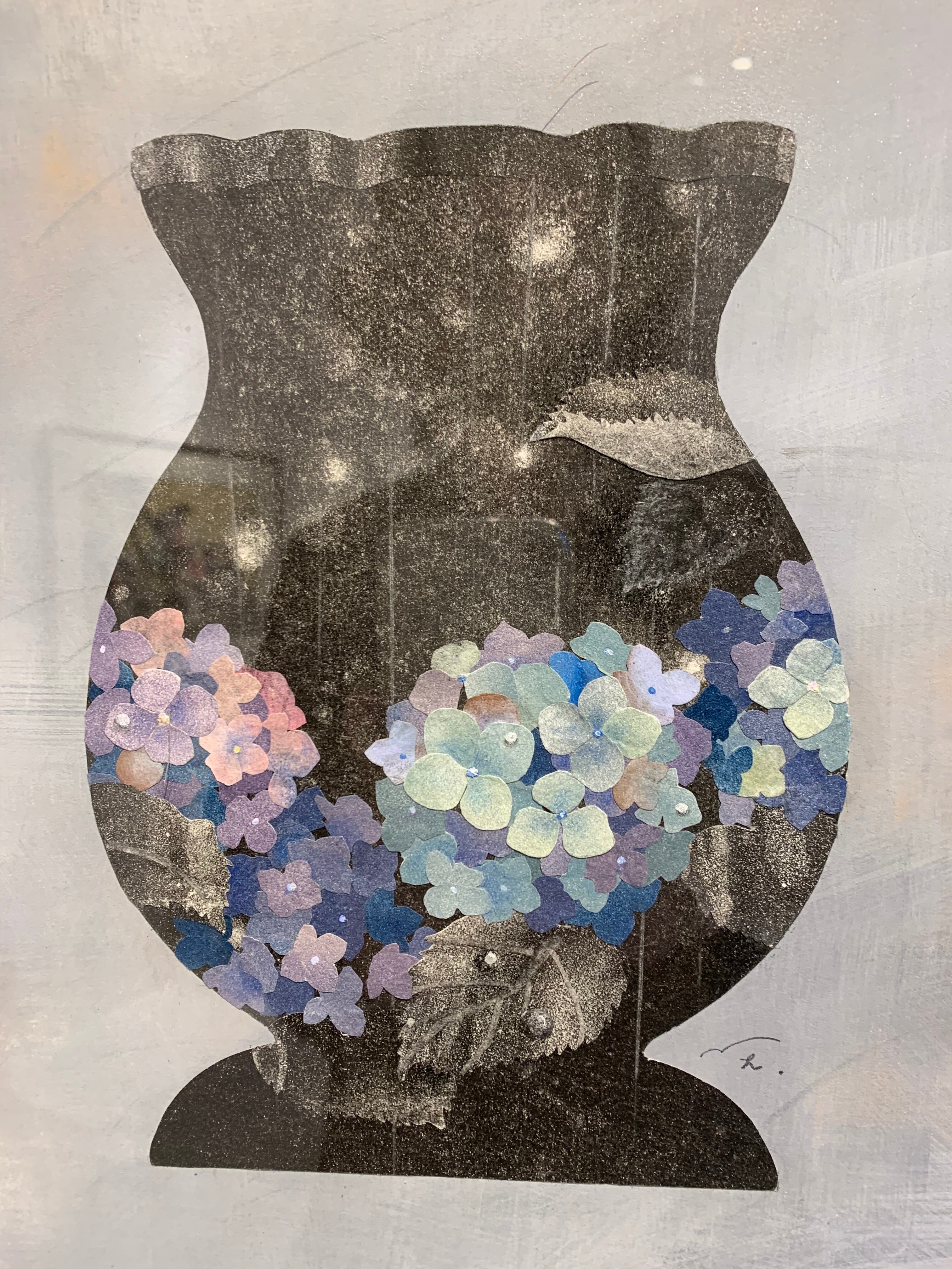 baggy 18「Vase-hydrangea-」295×210mm 銅版画コラージュ、アクリル、いづみ紙 2021 額付き