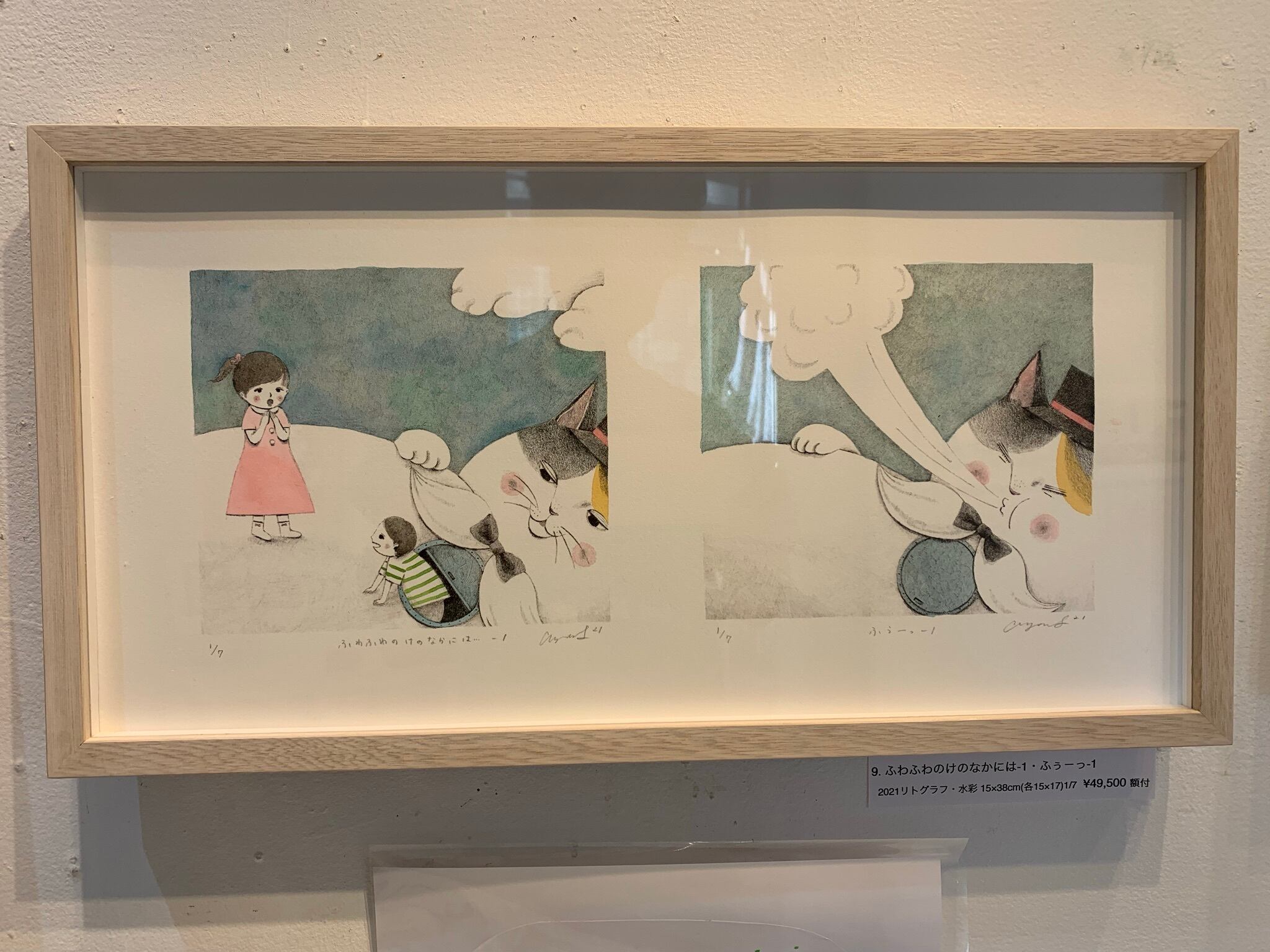 佐藤文音9「ふわふわのけのなかには-1ふぅーっ-1」リトグラフ・水彩 15×38cm(各15×17)/ed.7額付き 2021