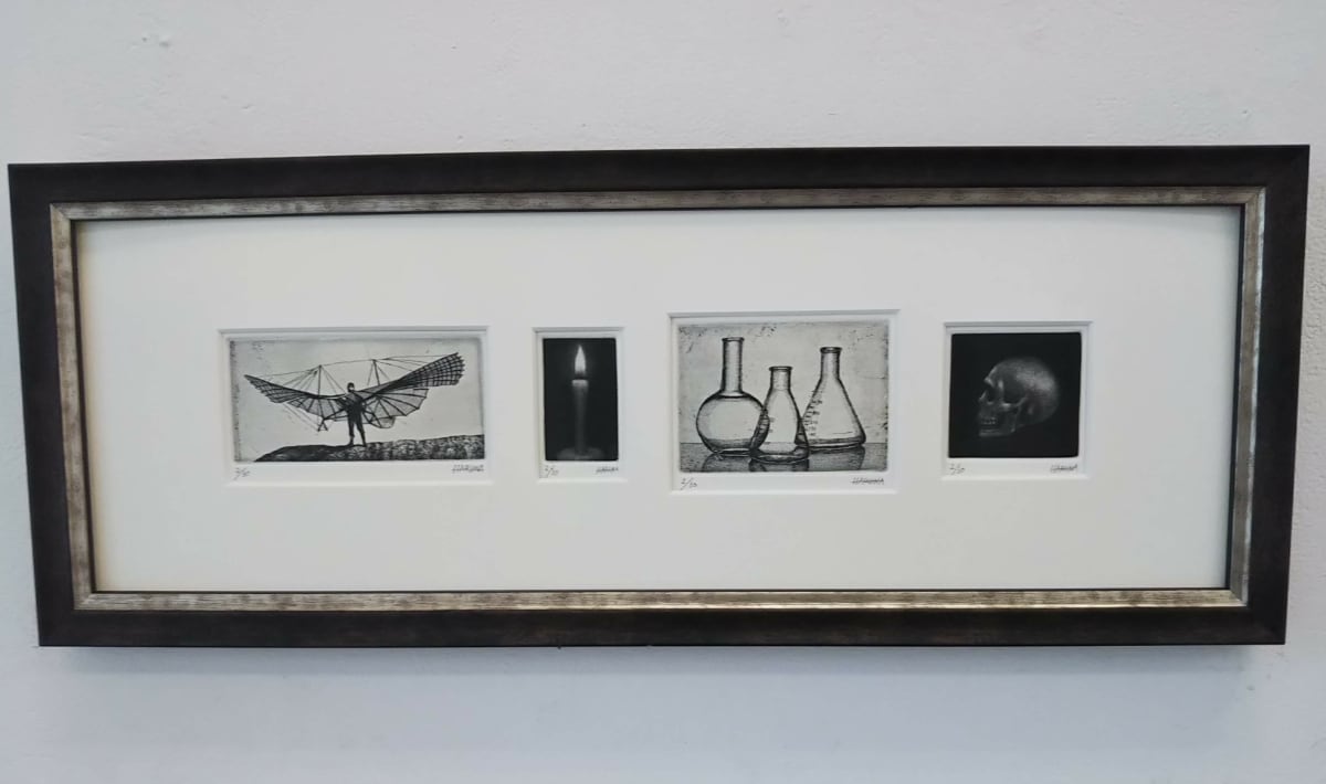 リリエンタールグライダー、蝋燭、フラスコ、頭骨の版画のセットです。