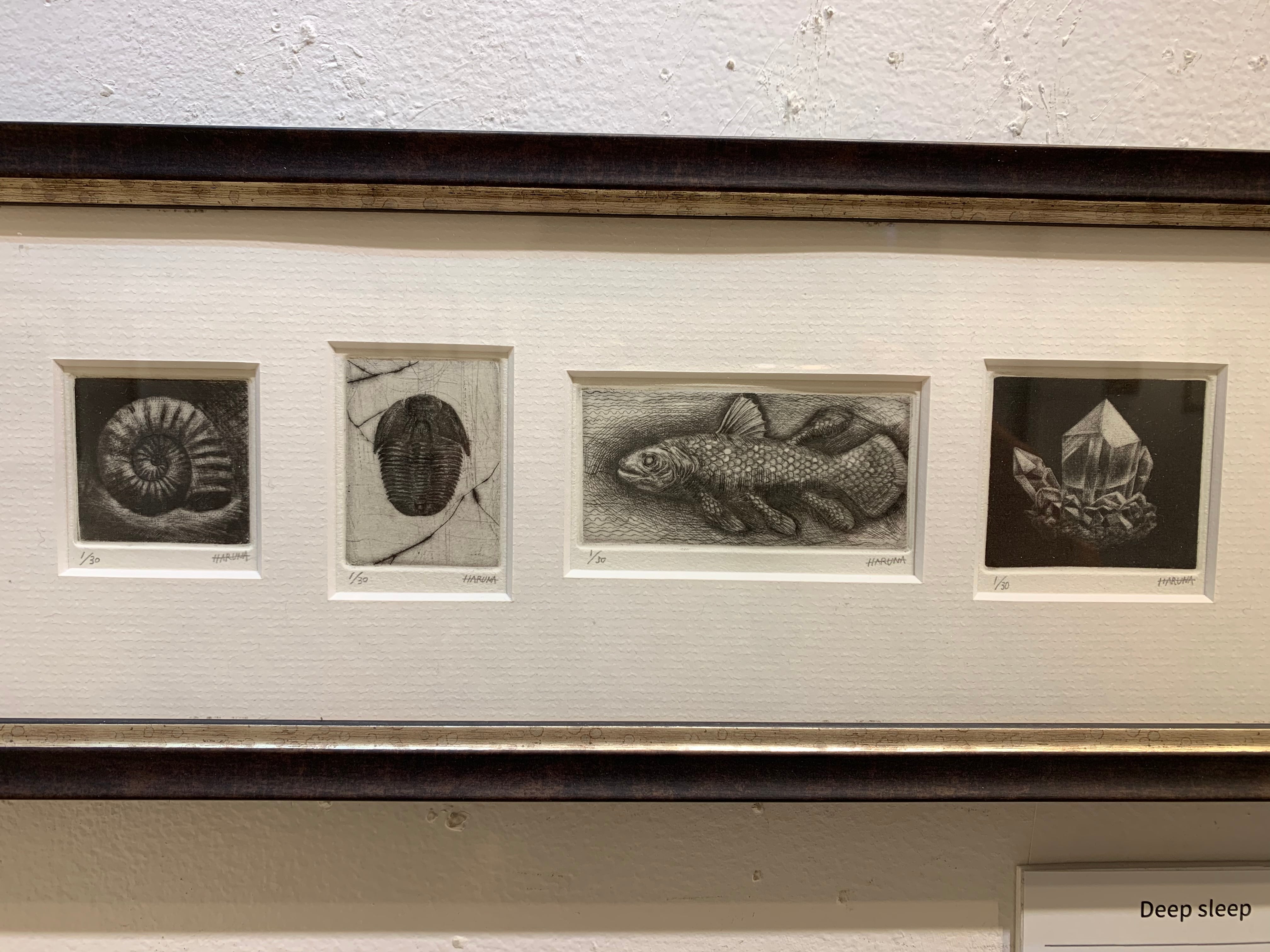 アンモナイト、三葉虫、シーラカンス、水晶の版画のセットです。小さく手軽なヴンダーカンマー(驚異の部屋)を表現したいと思い制作しました。