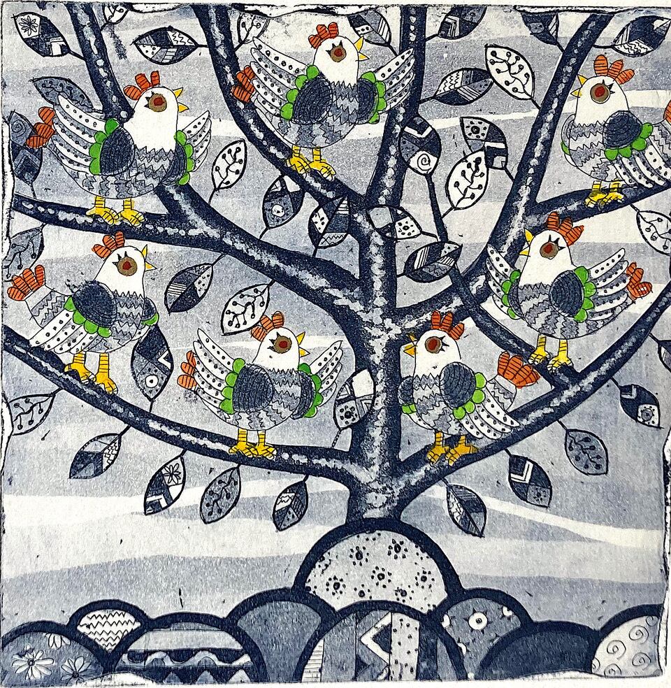朝日みお 「鳥が集まる木 Ⅱ」イメージ15×15cm / ed35 額装込み(A-16) 銅版画