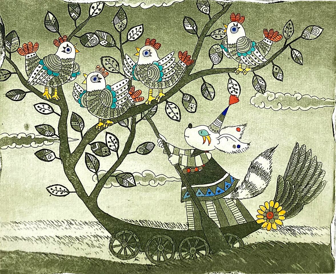 朝日みお 「旅は賑やかな方が楽しい」イメージ15×18cm / ed35 額装込み(A-13) 銅版画
