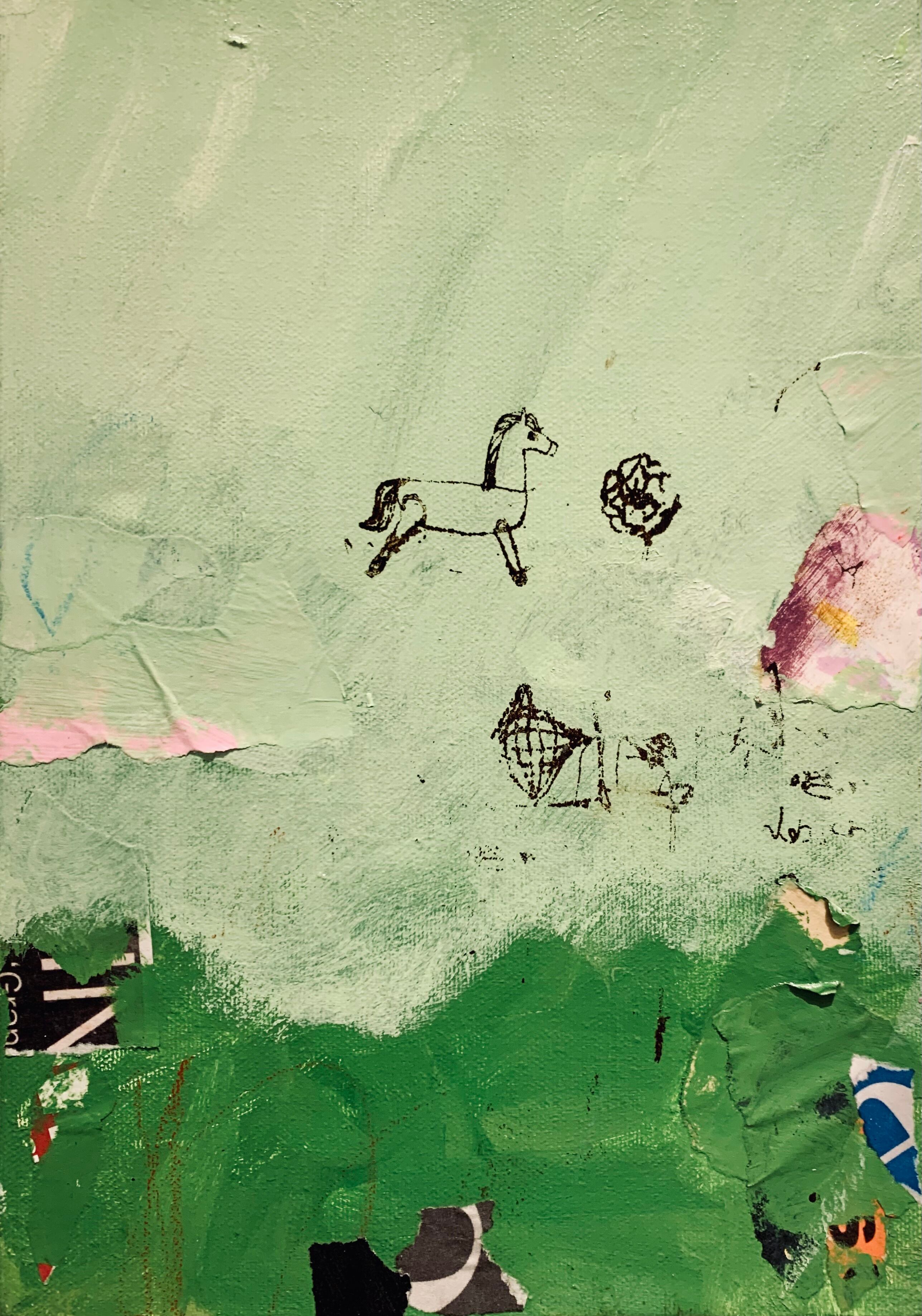 門馬則雄[29] Toy Horse 273×190mm キャンバスにアクリル絵具、ミクストメディア(シルクスクリーン、コラージュ、色鉛筆、オイルパステル)Acrylic mixed media on Canvas